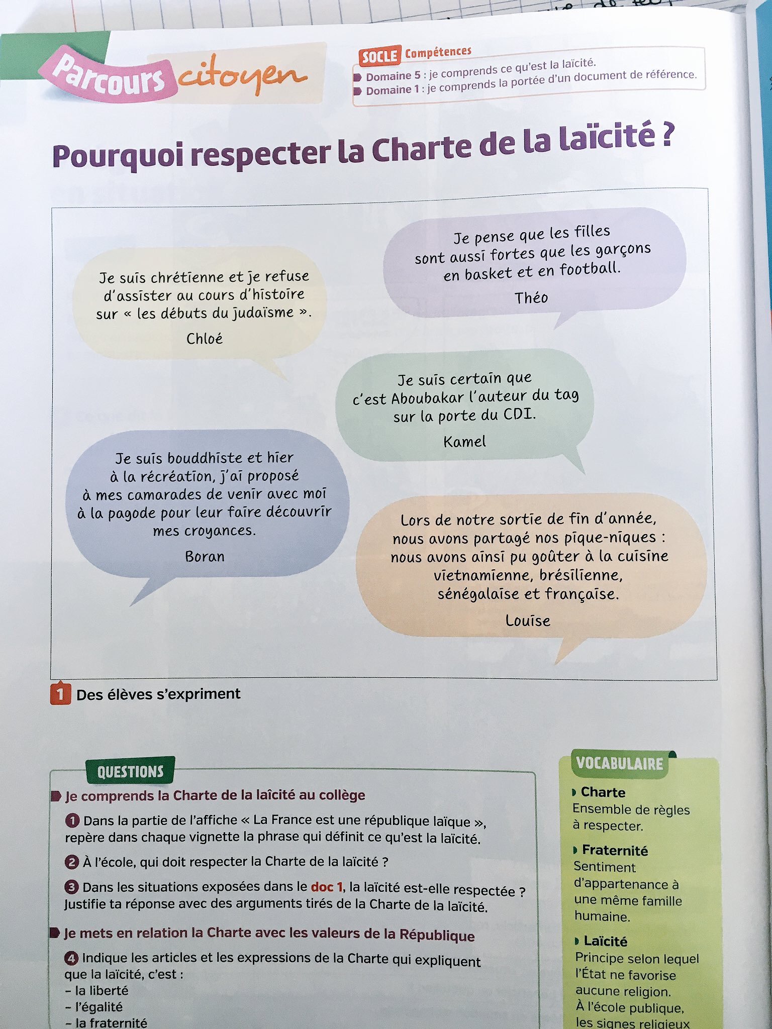 On ne chôme pas à l’Éducation Nationale Populaire Démocratique de France. La Propagande y est farouchement combattue et les élèves, notamment ceux de 3ème Prépa-Pro, sont habilement conscientisés comme en atteste cet extrait, fourni par un aimable lecteur que je remercie au passage, tiré d’un manuel de Français, Nouveau programme, de la collection Hachette Éducation, ISBN 978-2-01-399730-0, à la page 98.
