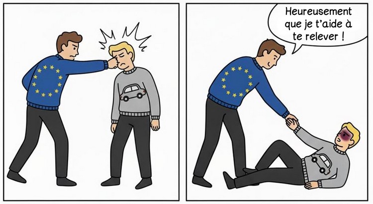 Pour notre fanfaron de chez Wish, pas de doute : grâce à ce plan, la Commission « sauve » l’automobile européenne. Après l’avoir très effectivement massacrée à coup de régulations toutes plus sottes les unes que les autres, après avoir envoyé un message désastreux aux constructeurs, après avoir fait exploser le coût de leur énergie de fonctionnement avec des politiques agressives, voilà nos politiciens frétillant d’aise à l’idée de relâcher la pression, fredonnant une petite chanson sur le thème « Nous vous sauvons de la mort en relâchant un peu notre étranglement ».