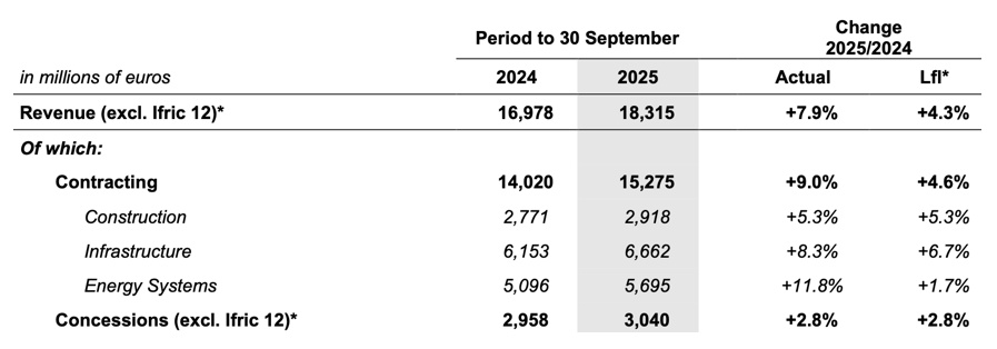 Les résultats du troisième trimestre montrent la performance pour l’année en cours, à fin septembre. Les revenus grimpent de 7,9 %. L’entreprise donne le détail de la croissance par catégorie d’activité. Elle fait une croissance de 5,3 % dans la construction, de 8,3 % dans l’infrastructure, et de 11,8 % dans la gestion d’énergies, dont la construction de parcs d’éoliennes par exemple.