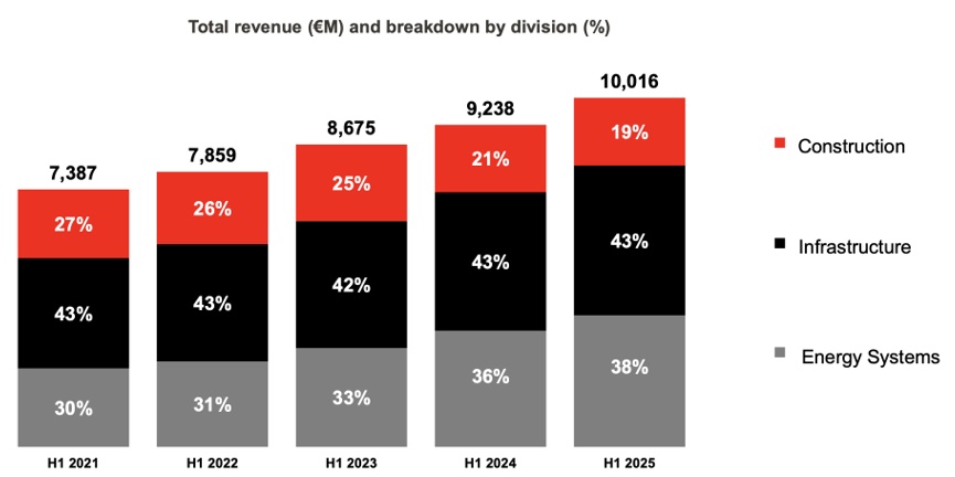 Le graphique ci-dessous montre l’évolution des revenus des 6 premiers mois de l’année, depuis 2021. La croissance provient en majorité de l’énergie (gris). L’énergie prend ainsi les devants sur la construction (rouge). Les activités dans les infrastructures (noir) grimpent au rythme de la croissance des revenus.