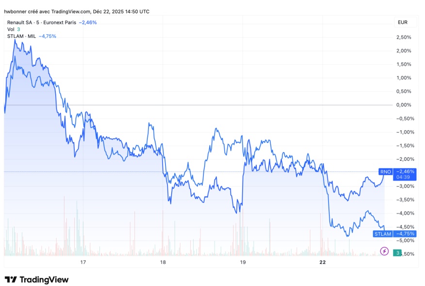 Cependant, les actions de Stellantis et Renault – ci-dessous – chutent en fin du mois en raison de déceptions autour du retrait de régulations.
