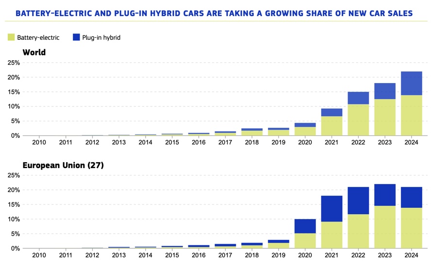 Le graphique ci-dessous, d’un rapport de la Commission, montre la part de marché de l’électrique dans le monde, et dans l’UE (source).