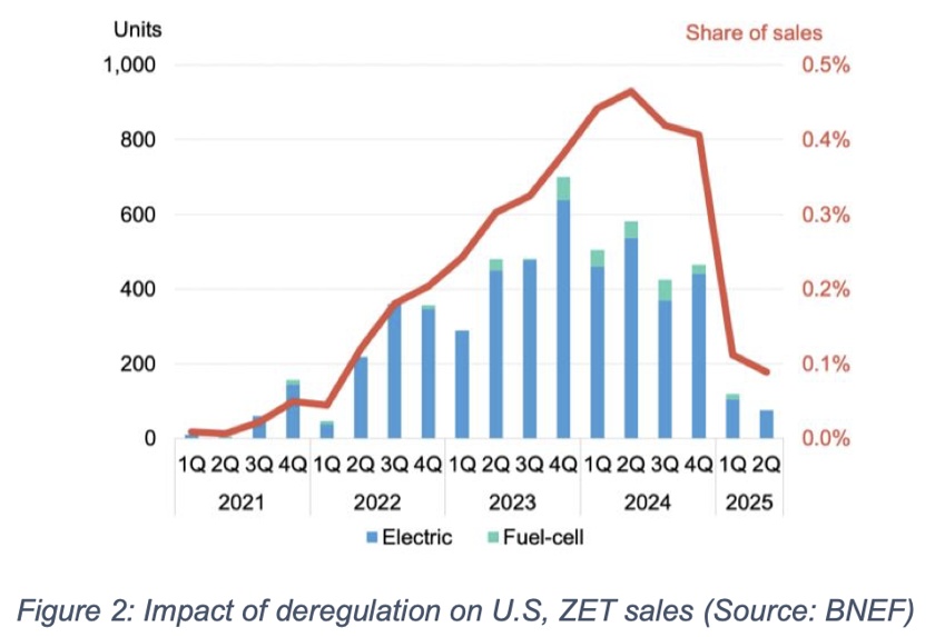 “Le retrait d’incitations fédérales américaines, et de régulations pour favoriser le secteur par l’administration de M. Trump, ont entraîné un effondrement des ventes de camions à batteries, de 80 % sur la première moitié de 2025. En révoquant les quotas d’émissions par les entreprises, qui favorisent les camions à batteries, les autorités européennes risquent de créer de l’incertitude sur l’évolution des régulations, et une réticence à l’investissement dans le secteur.”