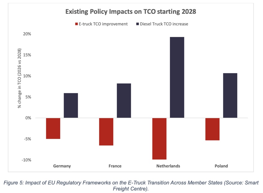 “L’analyse du Centre Smart Freight montre comment les régulations existantes de l’UE, dont les régulations RED III et ETS2, la directive Eurovignette, et les incitations financières des pays-membres, créent une pression significative pour la conversion des flottes de camions à l’électrique. Dans les régions les plus importantes pour le transport routier, dont la Pologne, l’Allemagne, la France, et les Pays-Bas, les mesures devraient donner l’avantage, sur les coûts d’achat et de fonctionnement, à l’électrique à partir de 2028, ce qui voudra dire que les camionneurs choisiront l’électrique pour des raisons de coûts.”